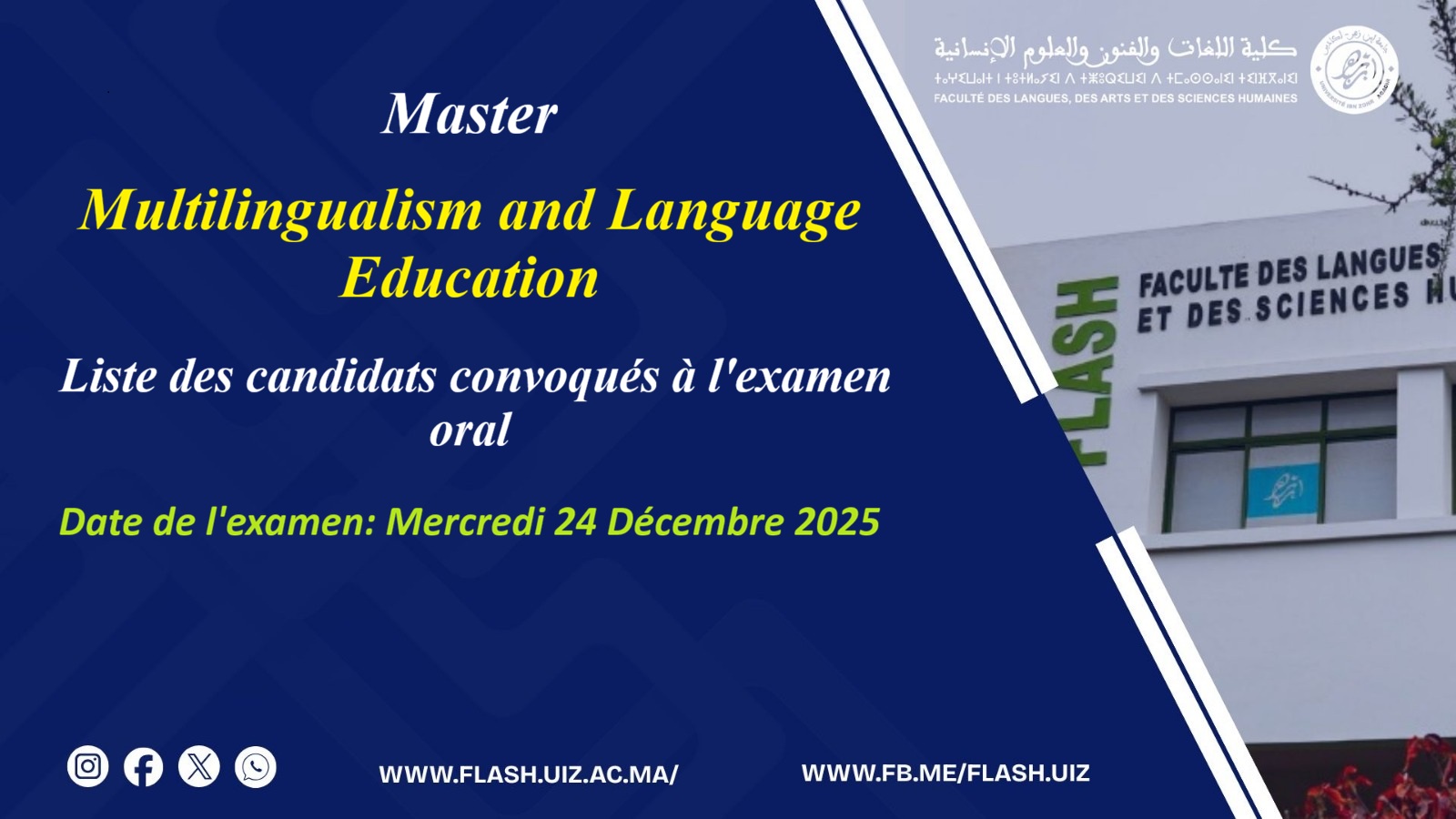 Multilingualism and Language Education / liste des candidats convoqués à l’examen oral Posted by abdelkader mellouk Categories Actualités Date December 22, 2025 Master Muliilngualism 2025Download Share: abdelkader mellouk Previous post إعلان عن مناقشة أطروحة دكتوراه December 22, 2025 Next post Master LETTRES ET ARTS / Liste des candidats retenus / 2025-2026 December 26, 2025 You may also like ماستر الموارد والتنمية الترابية (التوقيت الميسر) / لائحة الطلبة المقبولين برسم الموسم الجامعي 2025-2026 31 December, 2025 Master’s Program Multilingualism and Language Education / اللائحة النهائية للطلبة المقبولين 2025-2026 27 December, 2025 ماستر “الثقافة البصرية والوساطة الرقمية” / لائحة الطلبة المقبولين برسم الموسم الجامعي 2025-2026 26 December, 2025